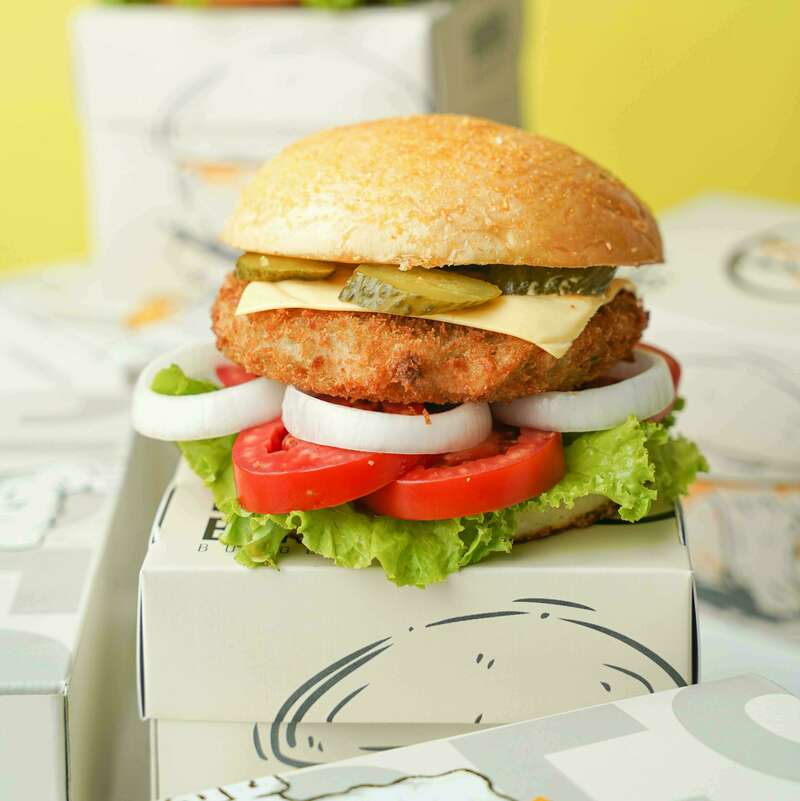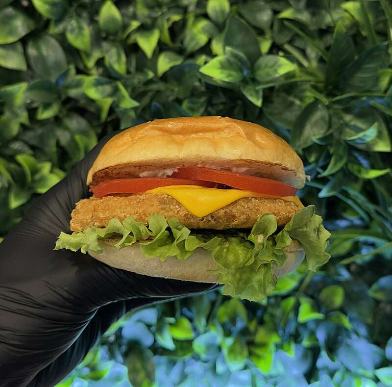 Galette de poulet panée, cheddar, salade, tomate, sauce burger