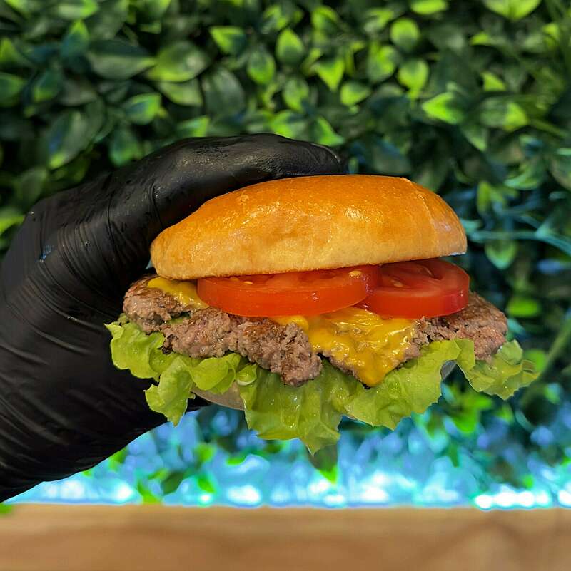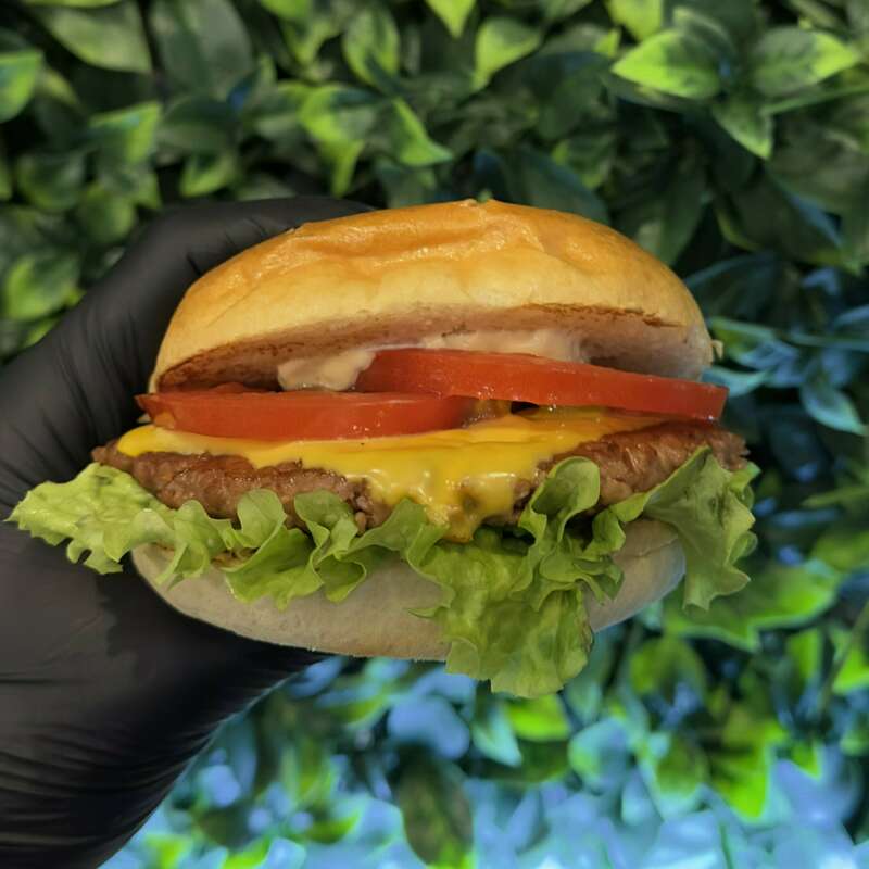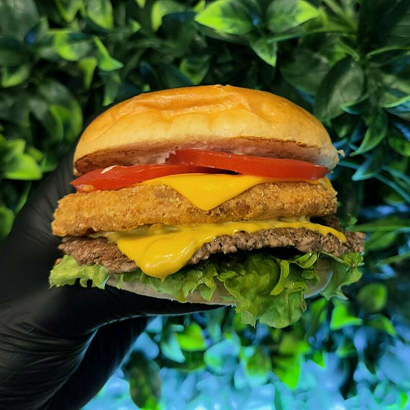 Galette de pouet panée, Steak version smash cuit fumé, cheddar, salade, tomate, sauce burger