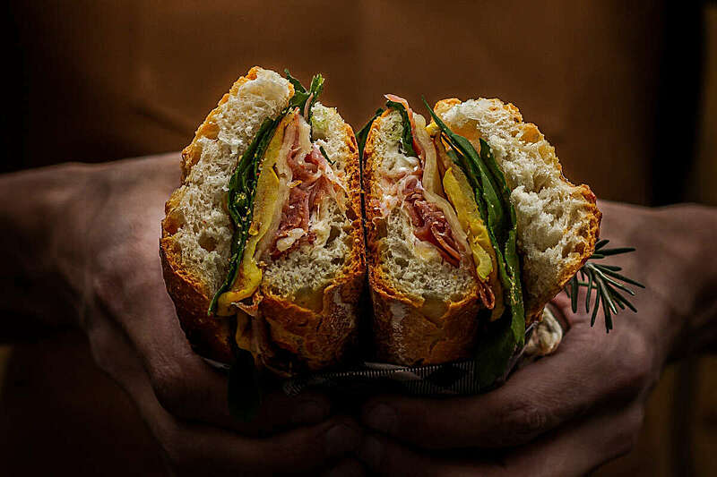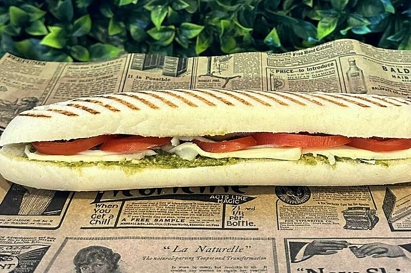 pain baguette au pavot, Salade, tomate, mozzarella , pesto, creme balsamique